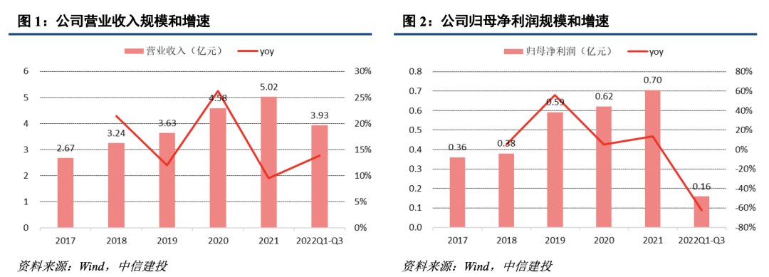 公司主要從事過濾材料、煙氣凈化系列環保產品的研發、生產、銷售,主要產品為各類耐高溫耐腐蝕濾袋和 SCR 脫硝催化劑,可應用于電力、鋼鐵及焦化、垃圾焚燒、水泥和玻璃等行業。2017-2021年公司營業收入CAGR為17.11%,歸母凈利潤CAGR為18.35%。