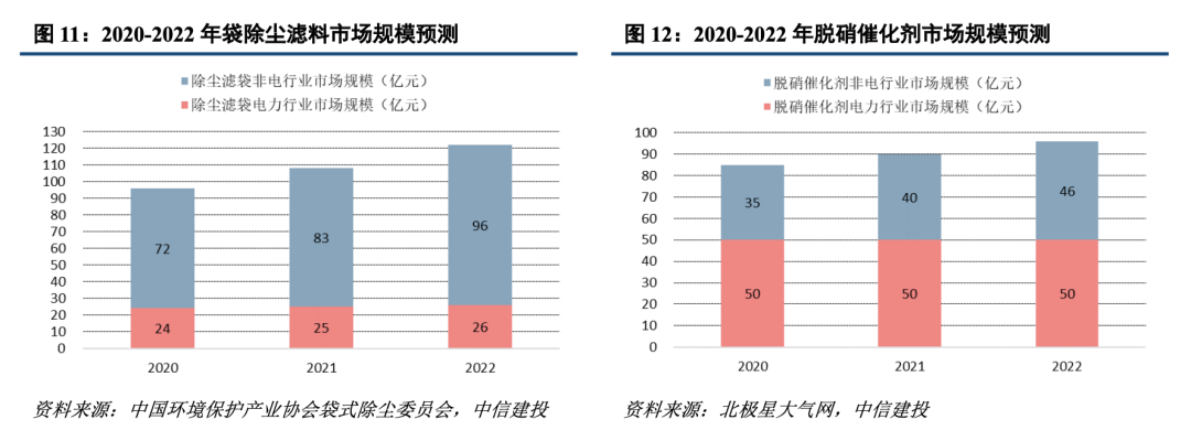 電力行業受益煤電投資,非電行業占比提升。電力為公司第一大業務,電力存量市場穩定,濾袋、脫硝催化劑市場規模分別為25、50億元左右,在保供+調峰的迫切需求下,煤電投資開始重回增長,未來幾年新增煤電機組有望觸底反彈,為電力行業濾袋和脫硝催化劑帶來新增安裝需求。非電行業如鋼鐵、水泥、垃圾焚燒、平板玻璃、陶瓷、非電燃煤鍋爐等將成為超低排放改造的主戰場,提供主要增量,特別是水泥賽道,省市政策尚未完全跟進,催化劑整體改造率不足10%,空間廣闊。預計2022年非電行業濾袋、脫硝催化劑市場規模分別為100、50億元左右,公司產品從以電力行業為主向電力和非電協同發展轉變,目前非電行業收入占比超過50%。隨著國家環保政策趨嚴,競爭能力較弱的中小企業將不斷退出,公司隨著產能擴張逐步落地,市占率有望持續提升。