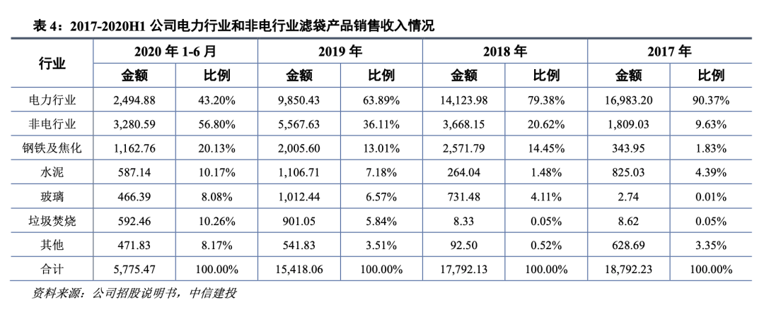 濾袋和催化劑都具備耗材屬性,平均替換周期在3-4年。公司濾袋業務優勢領域在電力和垃圾焚燒:電力行業價格因素占主導,公司市場份額前三;在垃圾焚燒領域,公司處于市場領先水平,憑借與垃圾焚燒最大廠商光大的深度合作積累了大量業務。公司催化劑業務優勢領域在電力、鋼鐵、小鍋爐:公司在區域性電廠和小鍋爐領域市場份額前三,鋼鐵行業市場份額第一。