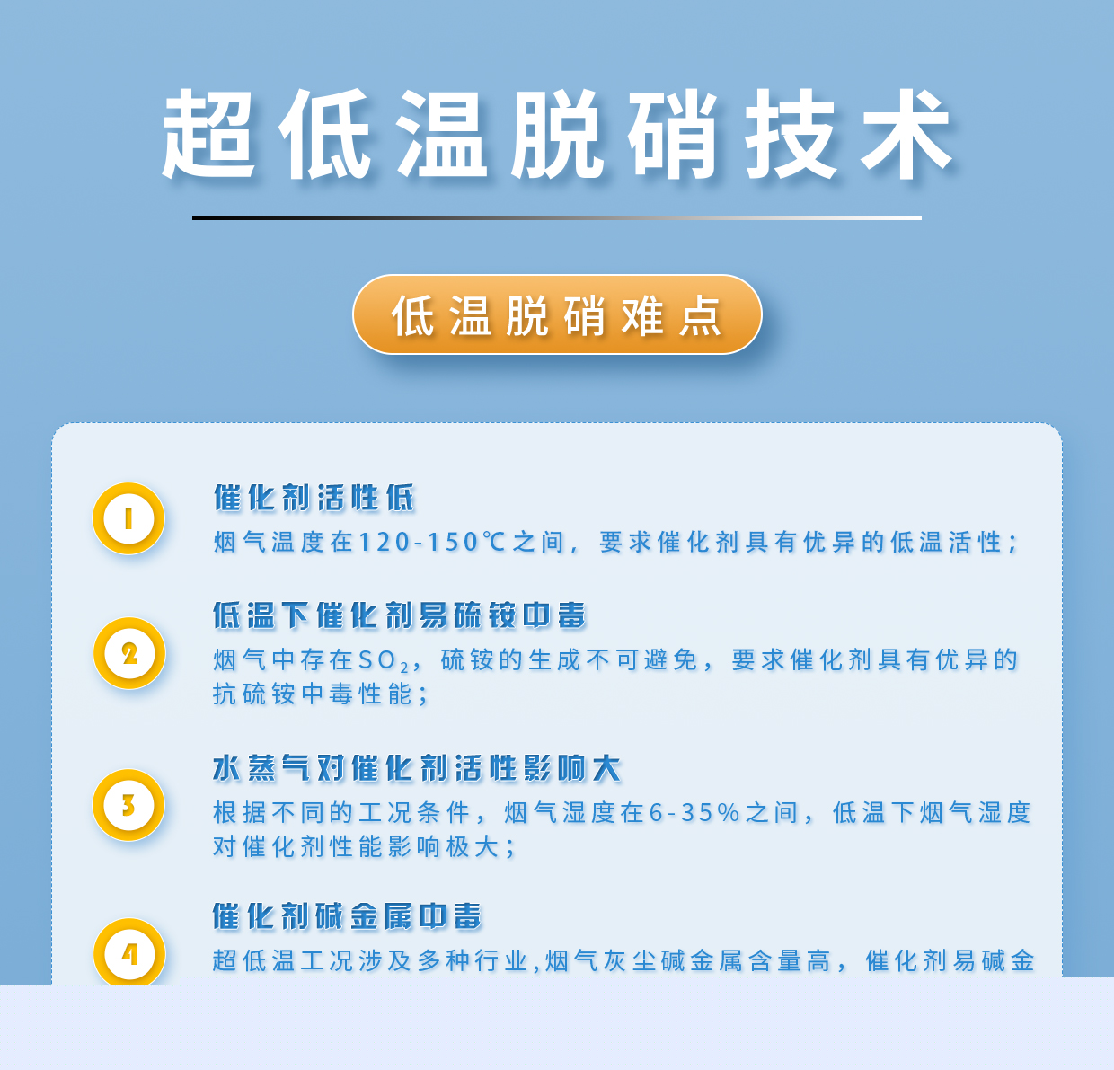 | 適用工況 | 低溫?zé)煔夤r,僅要求煙氣溫度≥120℃;煙氣含水量差異大,可達在10%~40%(vol%);可適應(yīng)危廢焚燒行業(yè)、垃圾焚燒行業(yè)、白灰行業(yè)、鋼鐵行業(yè)工況煙氣超低溫脫硝; |